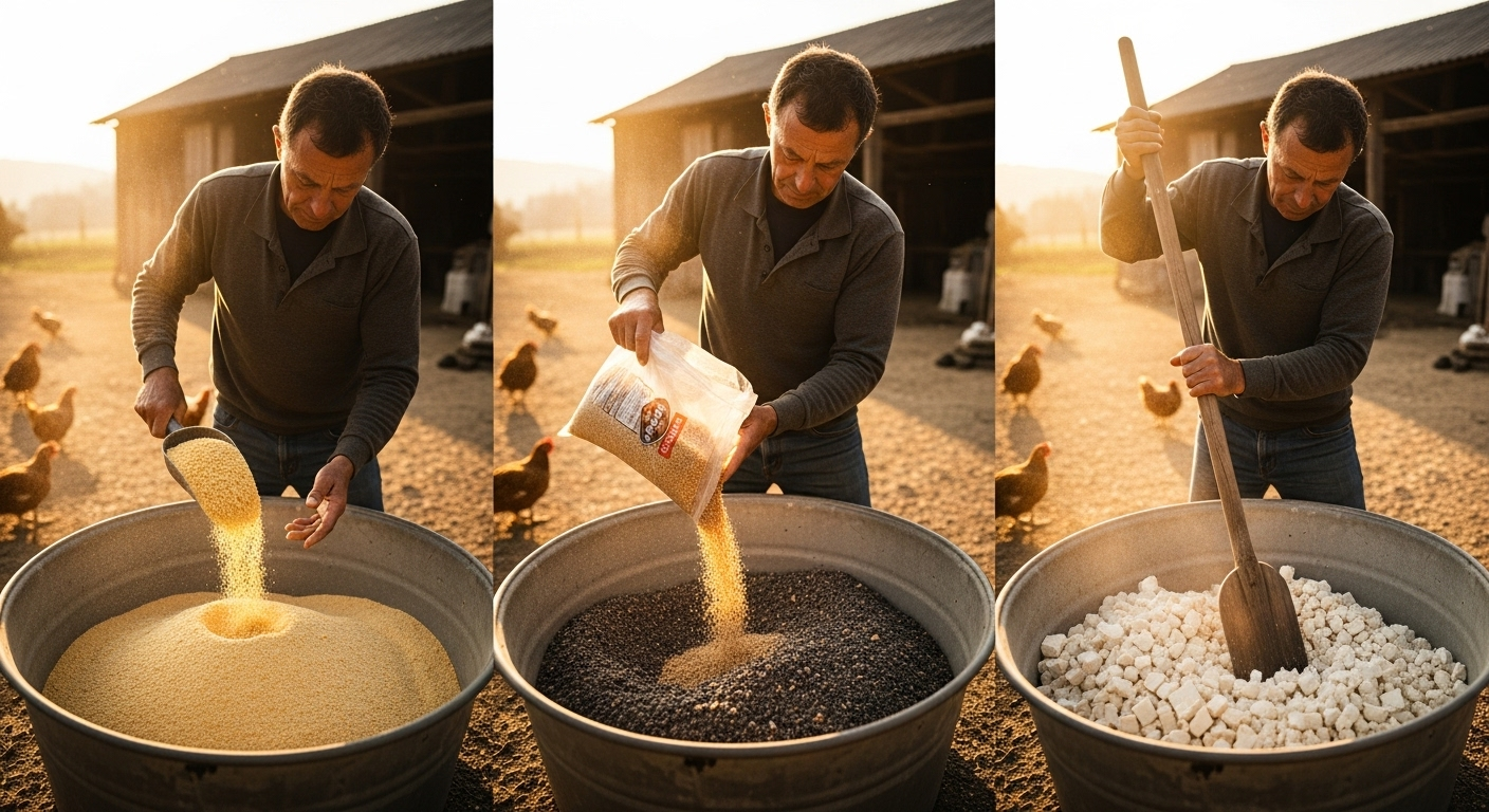 Membuat pakan sendiri (self-mixing) berarti Anda mencampur sendiri bahan-bahan baku, biasanya dengan tiga komponen utama: Sumber Energi, Sumber Protein, dan Konsentrat.