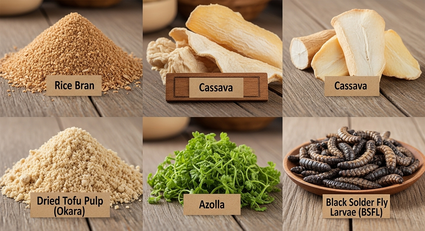 1. Bekatul/Dedak Padi: Paling umum digunakan. Murah, tetapi mengandung serat kasar tinggi, sehingga harus dibatasi maksimal 25% dari total ransum.