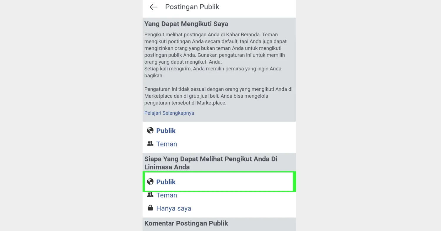 - Langkah berikutnya, scrool ke bawah guna menemukan menu Privasi dan setelahnya pilih Postingan Publik guna mengubah menjadi publik tepat berada di bagian bawah “Siapa Yg Dapat Melihat Pengikut Anda Dilinimasa Anda“