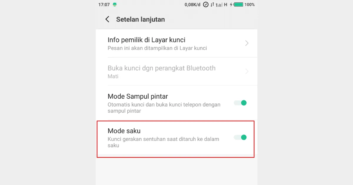 - Berikutnya, masuk pada setelan lanjutan untuk dapat mengaktifkan mode saku.