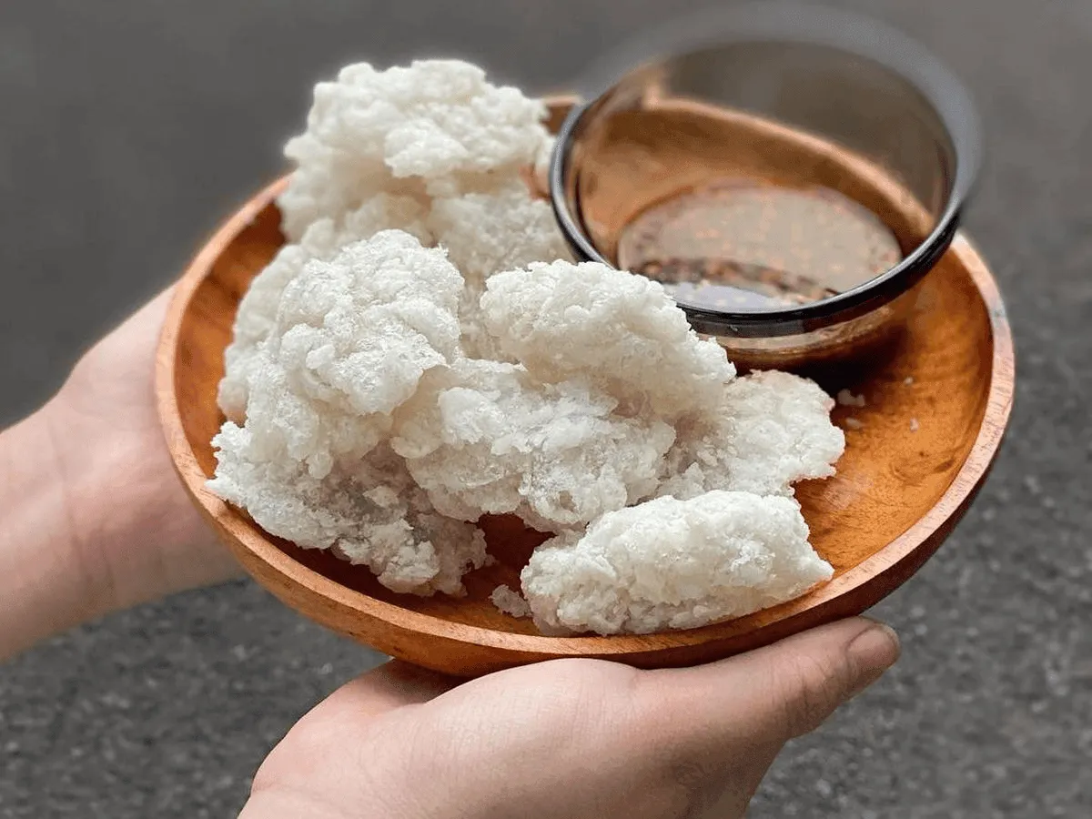 Adapun makanan ringan dingin satu ini berbahan dasar tepung hunkwe yang kemudian dibekukan sehingga teksturnya empuk dan rasanya pun manis.